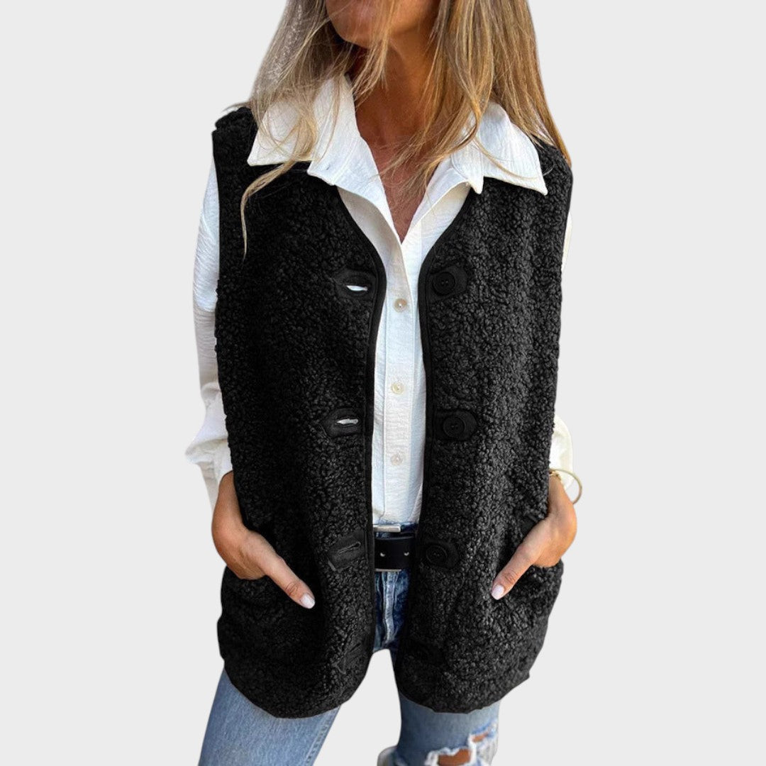 El chaleco Laynora combina una comodidad acogedora con un estilo moderno y versátil. Confeccionado en un tejido suave y afelpado, ofrece una textura cálida y agradable que realza cualquier look casual. Su diseño incluye botones frontales resistentes, prácticos bolsillos laterales y un corte ligeramente holgado que favorece a diferentes tipos de cuerpo. Ideal para llevar sobre camisas, prendas de punto o suéteres ligeros, lo que lo hace perfecto para entretiempo o para crear conjuntos con estilo en invierno.
