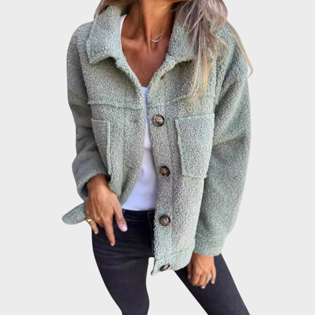 La chaqueta Dina es la combinación perfecta entre comodidad y estilo. Confeccionada en suave tejido tipo shearling (piel sintética de oveja), ofrece un tacto cálido y elegante, ideal para los días más fríos. Su diseño moderno cuenta con botones frontales, amplios bolsillos y un corte holgado, lo que garantiza libertad de movimiento y un look desenfadado. Perfecto para crear looks informales con vaqueros y camisetas, o para un estilo más sofisticado con botas y accesorios.